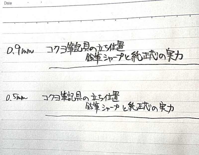 実際に書き比べた画像です。上がコクヨの鉛筆シャープ0.9mm、下が他メーカーの0.5mmのシャープペンです。