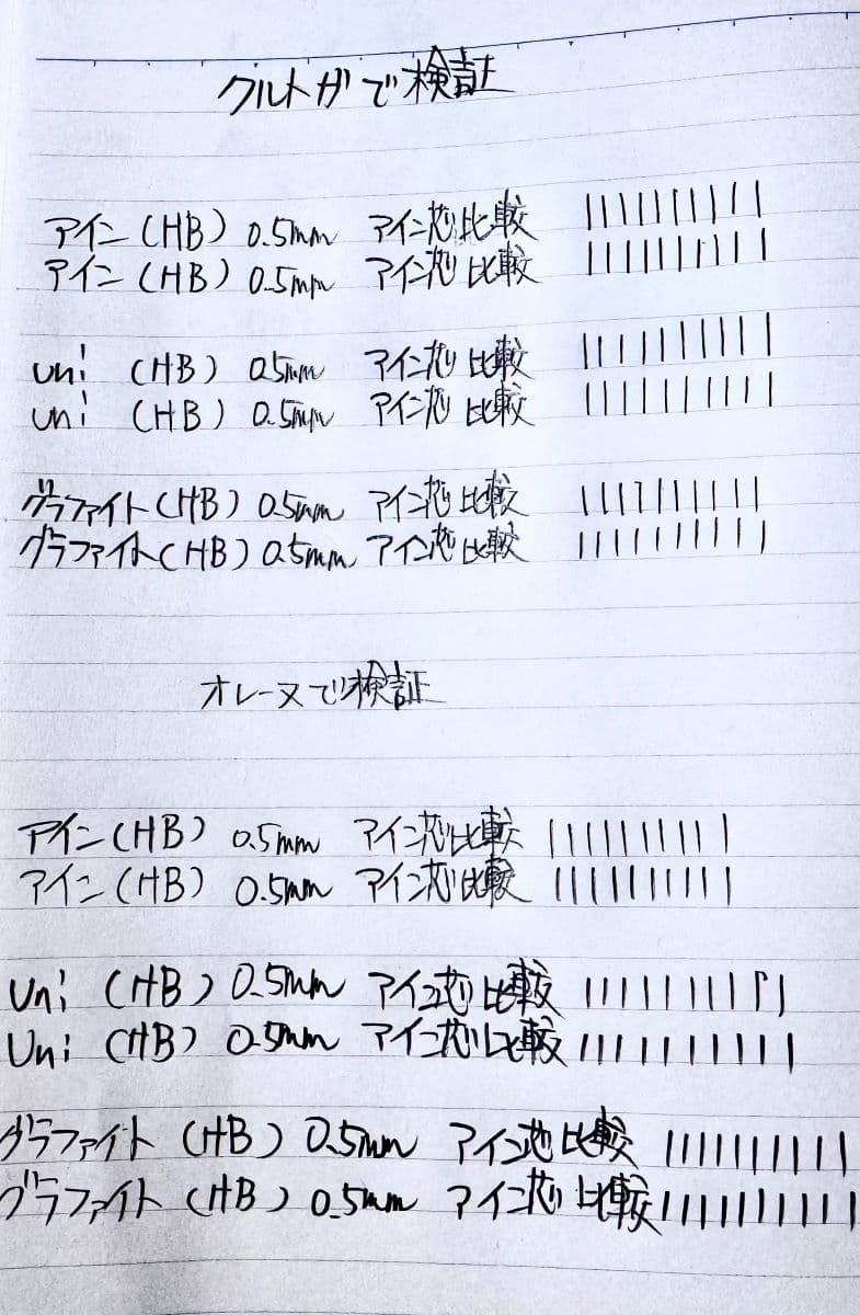 実際に書き比べてみると、uniやグラファイトも十分に濃く書けて、正直なところアイン芯だけが飛び抜けて濃いとは感じませんでした。